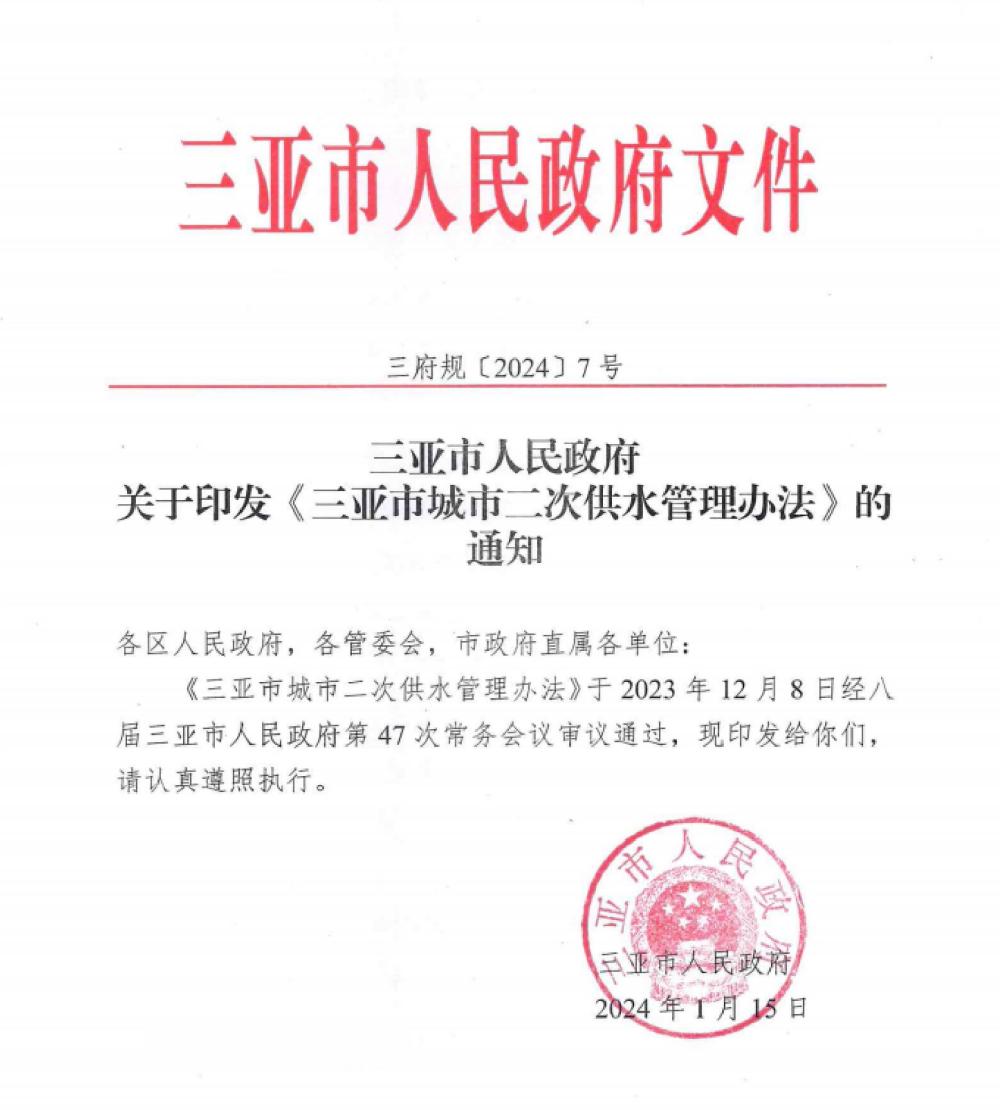 三亞市人民政府關(guān)于印發(fā)《三亞市城市二次供水管理辦法》的通知