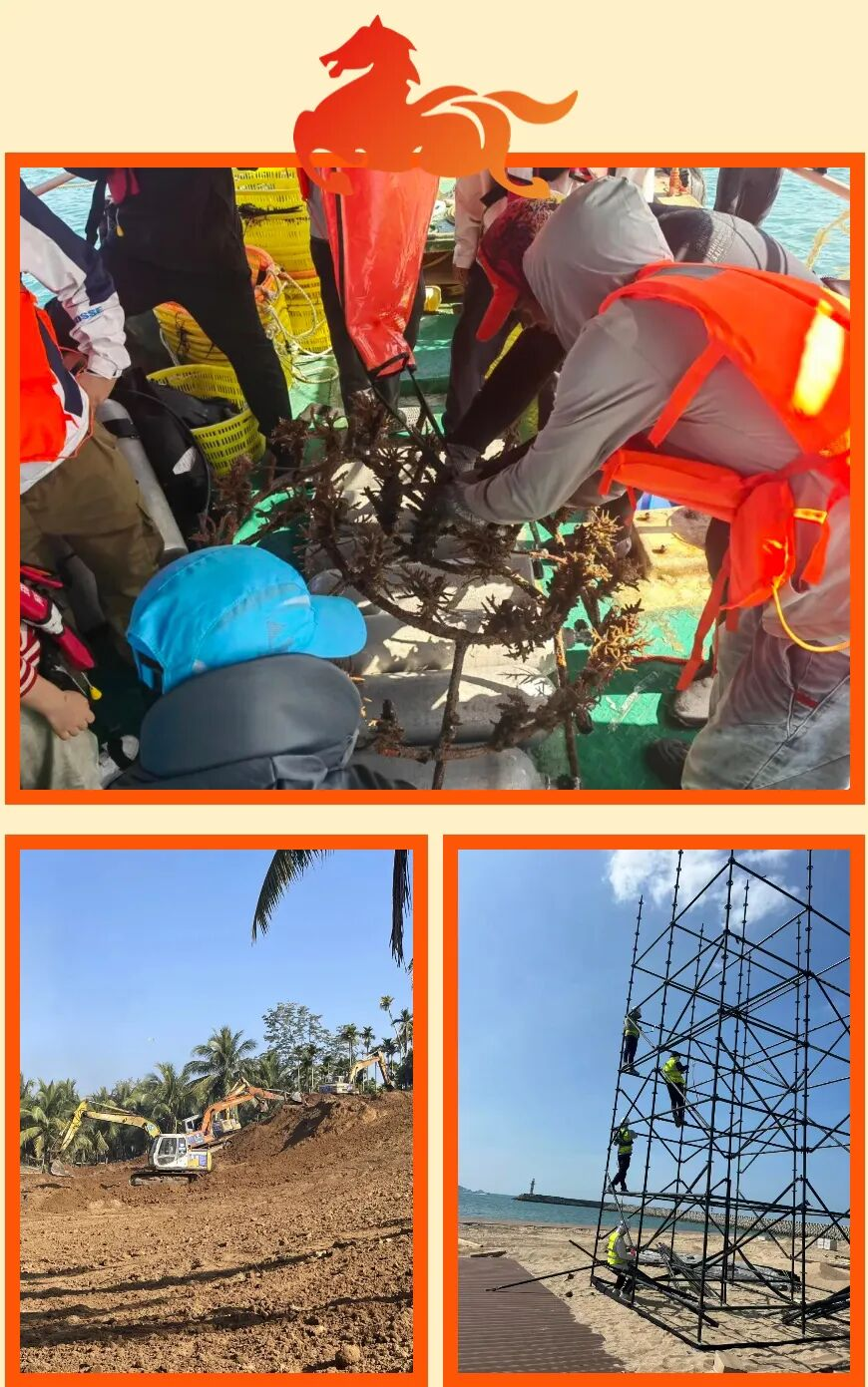環(huán)通公司承建的亞沙會(huì)設(shè)施建設(shè)等重點(diǎn)項(xiàng)目假期不曾停工,施工現(xiàn)場(chǎng)機(jī)器轟鳴、人員干勁十足,呈現(xiàn)出一派熱火朝天的景象。三亞灣近岸珊瑚礁生態(tài)系統(tǒng)修復(fù)項(xiàng)目搶抓天氣窗口期推進(jìn)珊瑚礁移植;第六屆亞洲沙灘運(yùn)動(dòng)會(huì)設(shè)施建設(shè)項(xiàng)目的場(chǎng)館主體建設(shè)、電力保障子項(xiàng)目同步發(fā)力,為賽事舉辦保駕護(hù)航;三亞市藤橋河流域生態(tài)修復(fù)工程全面展開河道整治、生態(tài)修復(fù)作業(yè),打造生態(tài)廊道。新一年,公司將錨定目標(biāo)、加壓奮進(jìn),以優(yōu)質(zhì)工程助力三亞城市建設(shè)與生態(tài)環(huán)境保護(hù)。
